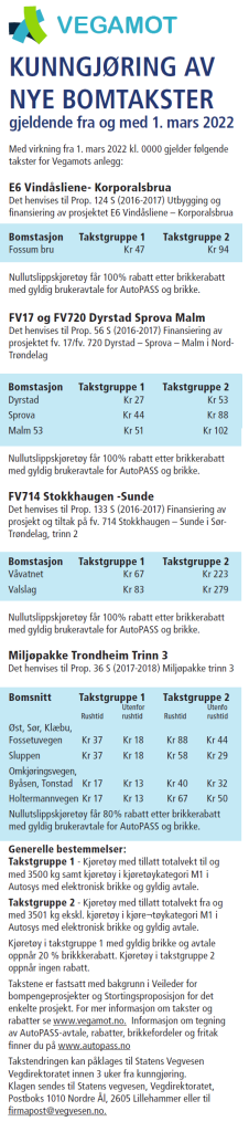 Nye bomtakster er gjeldende fra og med 1. mars 2022.